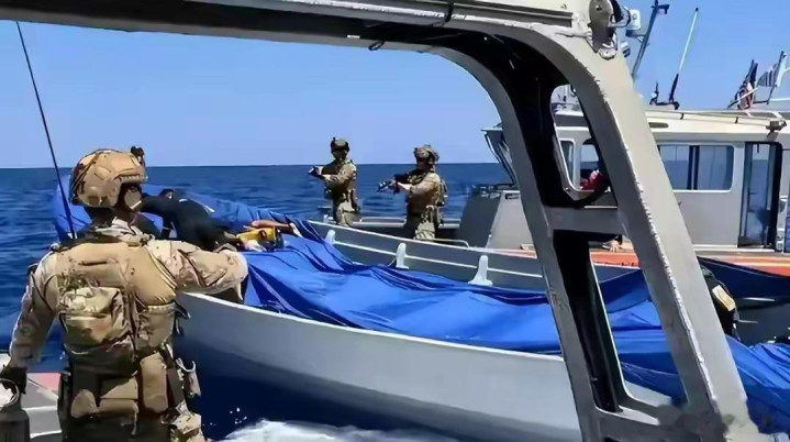 从现场画面看,武装直升机低空悬停、特战队员快速索降、战船武力威慑,整套作为充满暴力抑遏意味,名为法则,实为劫执。